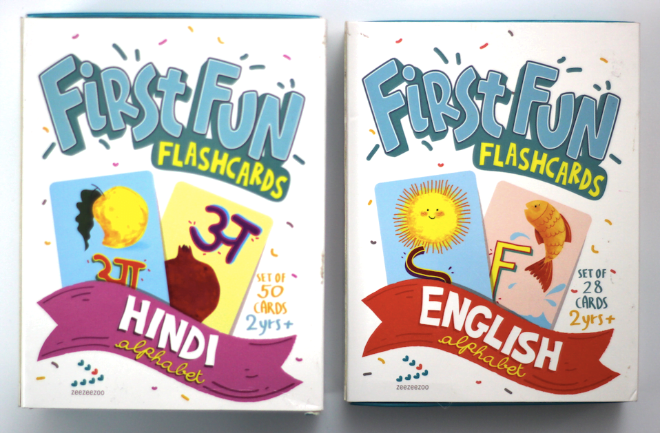 If you are raising children as bilingual, this two-set pack is ideal. Zeezeezoo’s First Fun Flashcards makes learning the English and Hindi Alphabets an enjoyable and interactive experience for young children. This set of double-sided cards feature colourful hand-drawn illustrations on the front, and an informative back side with upper + lower case letters, and examples of words beginning with each letter. The use of hand-drawn illustrations in vibrant colours is intentional. Many studies have shown the importance of colour in learning. It is a powerful stimulus and enables greater and easier learning and remembering. The cards follow a 3-stage learning process, which is found on the instruction card inside the pack. Priced at Rs. 785/-