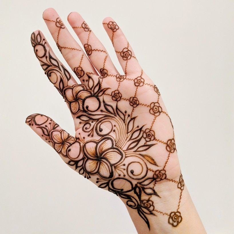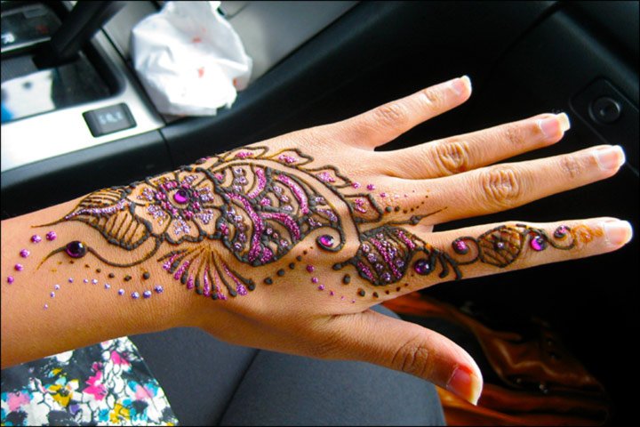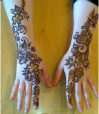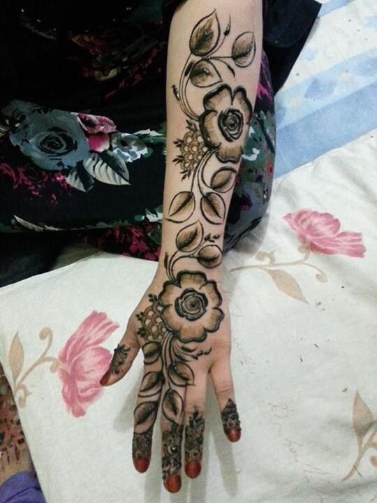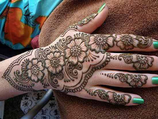 Many designs are a mix of Indian and Arabic, giving the floral pattern a unique look. Many designs with the use of color and glitter cover the space between petals, bringing alive the flowers on hand.