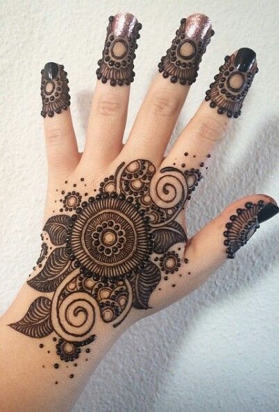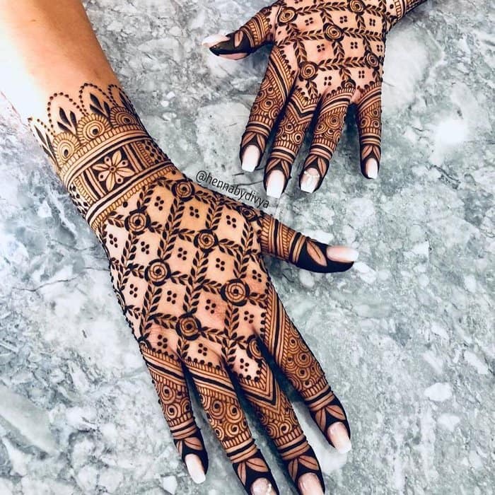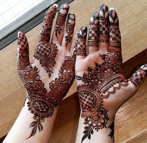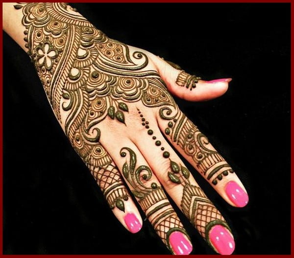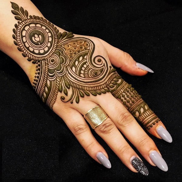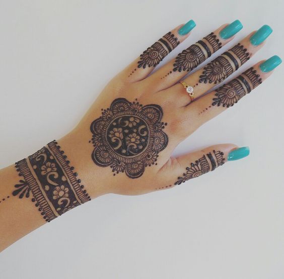 Mainly found in the Arabic and Moroccan style of Mehendi, geometric patterns with the play of thin and thick lines look really smart and are almost like a modern art form of mehendi. Geometric designs are mainly preferred by those who do not like their palms to be fully covered in mehendi, but want just a small portion of their palms adorned. If you want a contemporary and trendy look then the geometric pattern is the one for you. Try these simple mehndi designs for front hands.