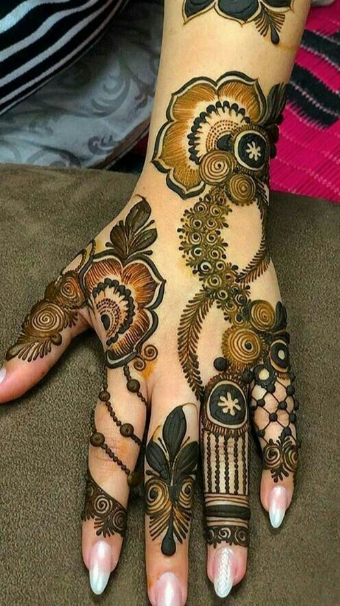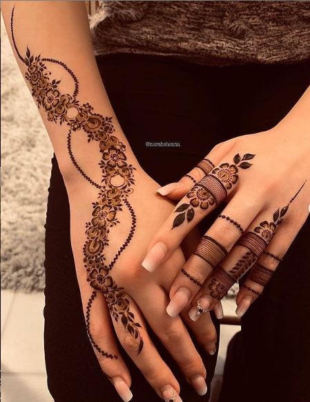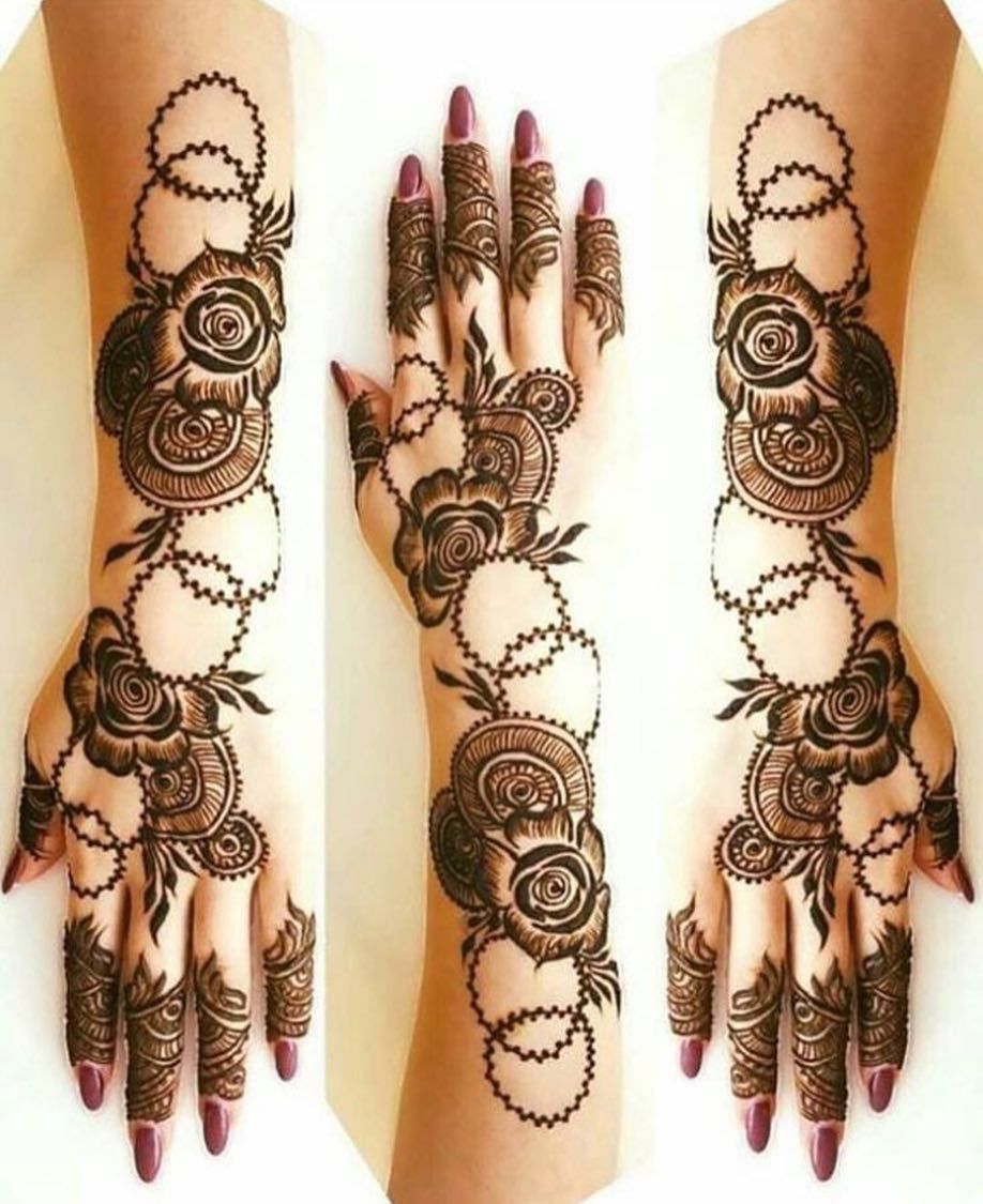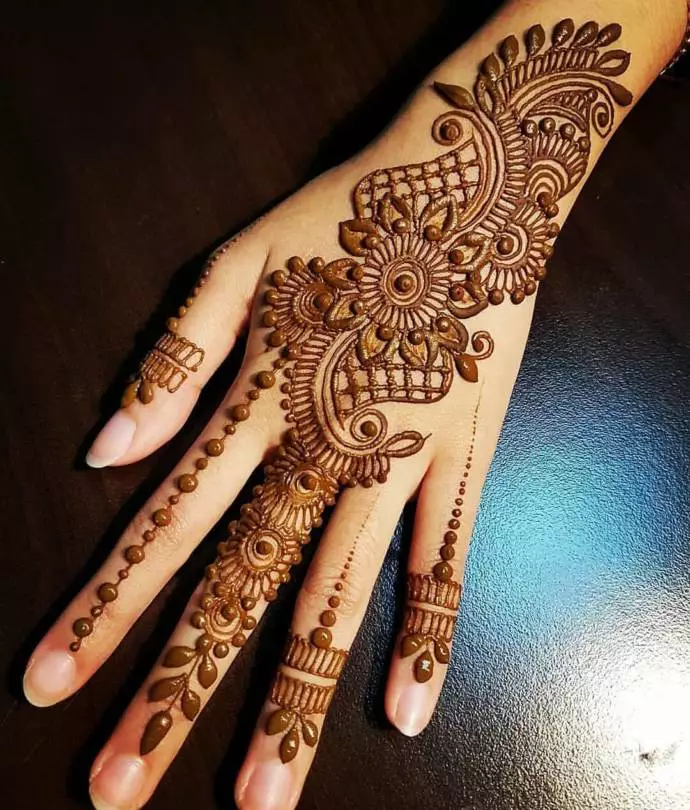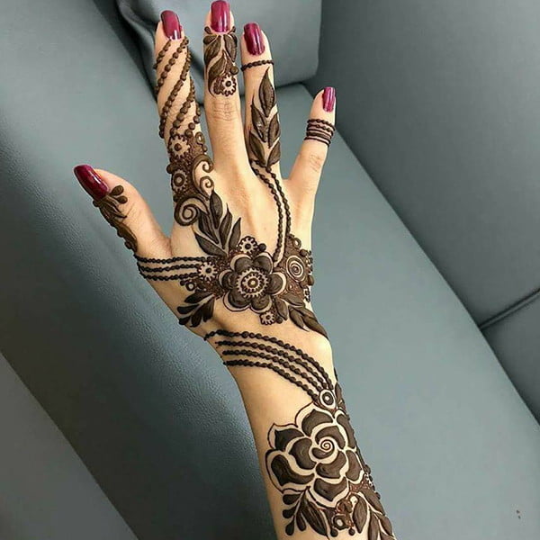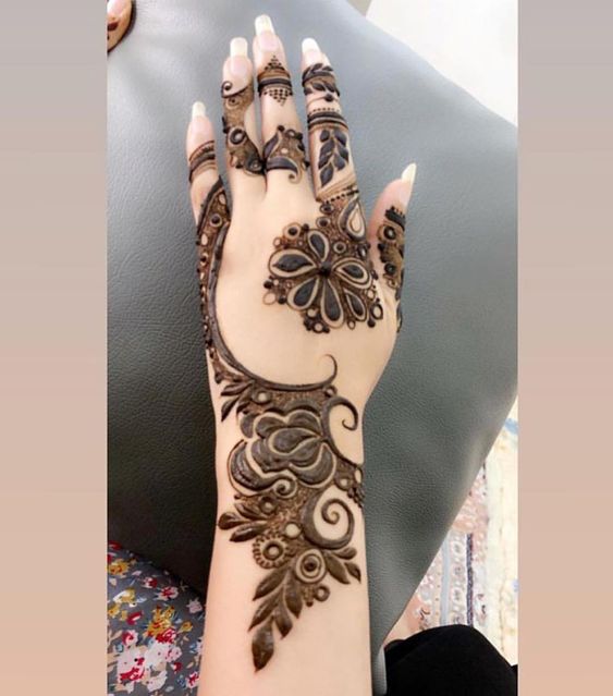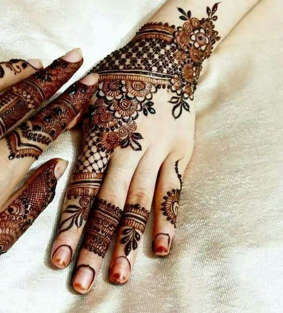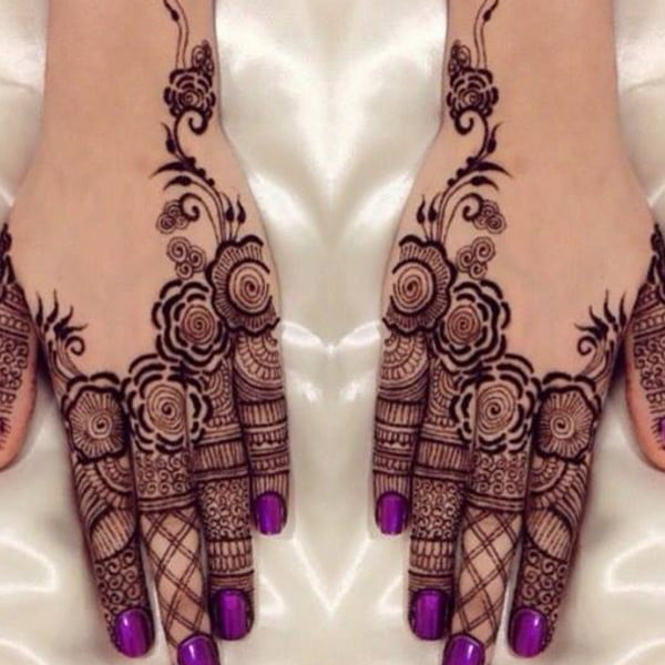 Arabic designs use a lot of shading. Rose petals, mango leaves, and netted pattern with the play of shading makes these easy back hand mehndi design look very attractive. Most of the Arabic designs are on the palms, wrist, and fingers. Simple to make, anyone who loves mehendi can easily apply.
