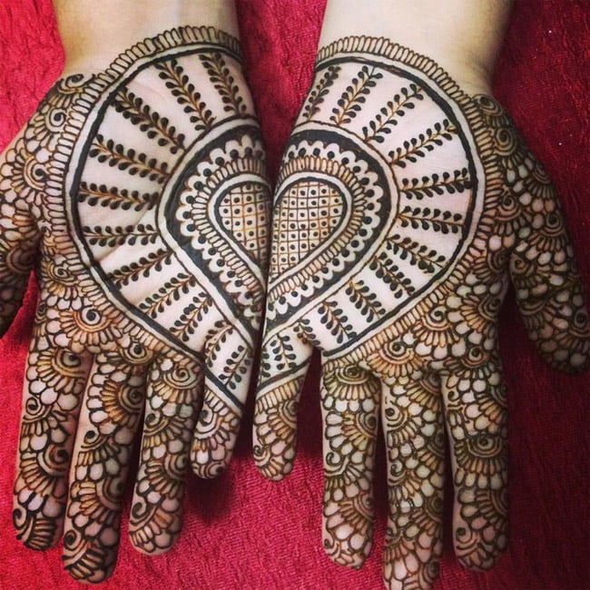 These patterns are popular in the Gujarati and Rajasthani mehendi. Mango leaves are symbolic of the summers. A single mango leaf in the middle of the palm or two leaves placed side by side with a netted pattern of floral and geometric designs with shades that look extremely beautiful. Also, small flowers on the border, play of dots, or simple application of thin and thick lines are some ideas that can work for women across age groups.