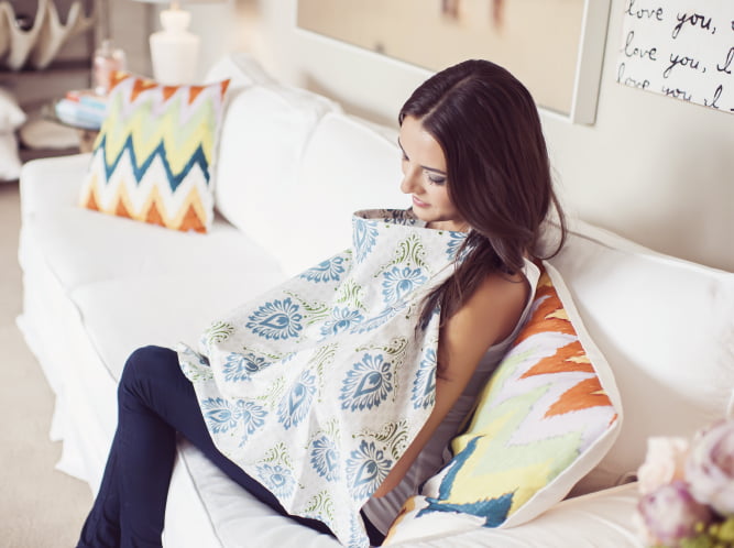 Try to get a nursing cover or nursing sheet, which not only covers the front part of your breast but also covered the front and back of your body and your child entirely. This would not only comfort the baby but also make you less conscious of your body. A big soft nursing sheet should be user-friendly for both mother and the baby.