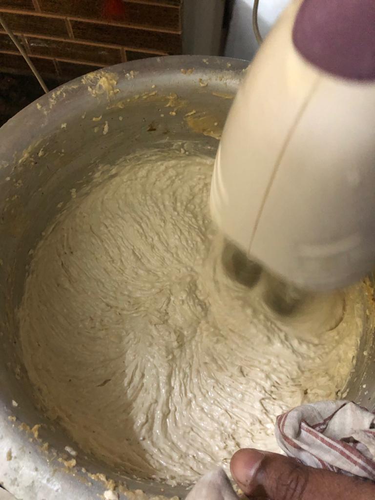 - Pour the batter into a greased cake pan and bake it in the preheated oven (at 160degree C) for 30 minutes. Make sure the cake is dark brown and a skewer/toothpick if inserted comes out with crumbs. Once the cake is baked properly, let it cool and dust with icing sugar.